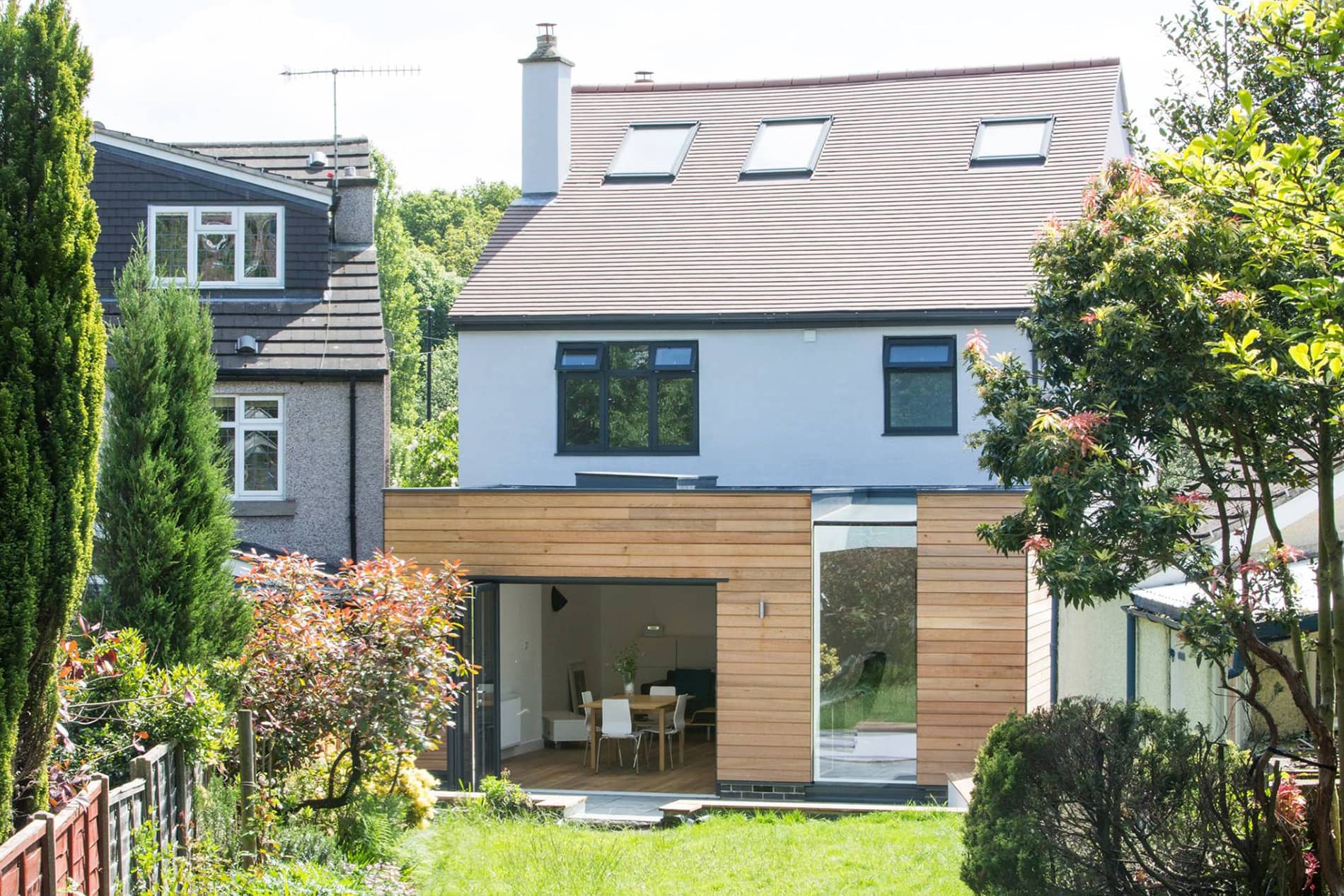 This contemporary home extension is clad in timber and creates a large open plan kitchen, dining and sitting area to the rear of the house. The kitchen was designed and hand crafted by Wood & Wire and the space is defined by a large feature wall to roof eaves glazing system which floods the space with natural light. All frames are recessed to create a seamless divide between inside and outside. Bi fold doors open the dining space onto the rear garden bringing the outside and making it the perfect entertaining space.